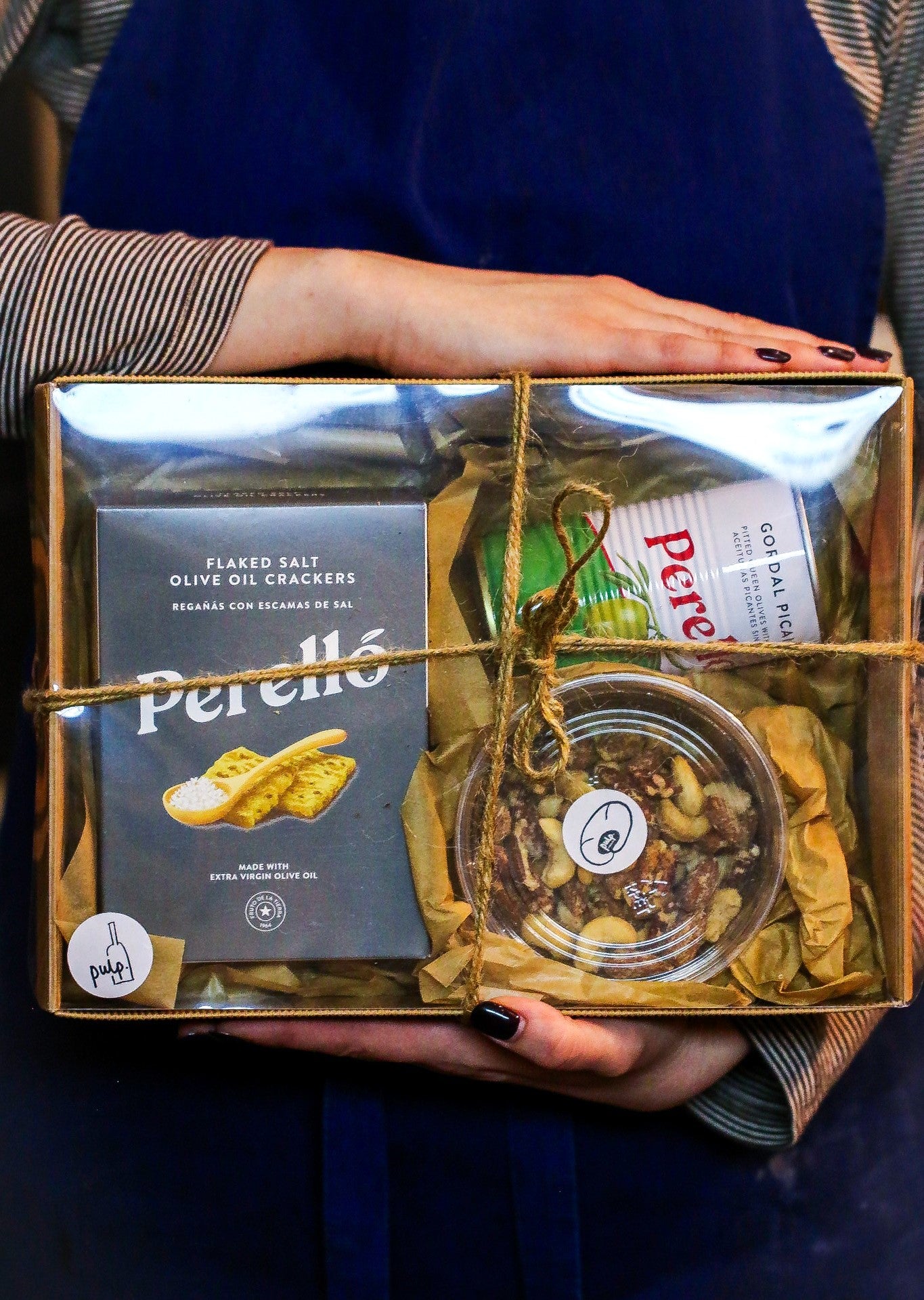 Our favourite items from Perelló, a can of spicy, pitted Gordal olives, salty crackers & a pot of truffle & pecorino nuts. Literally the best snack box ever!