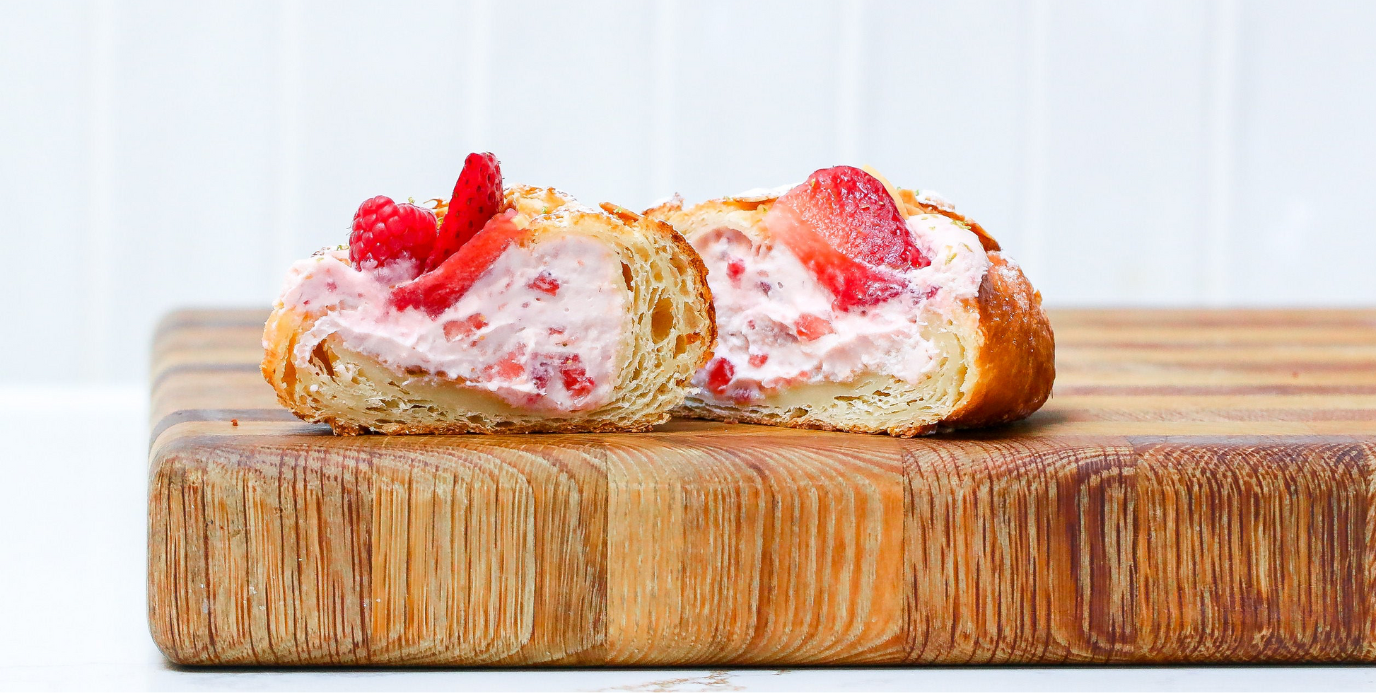 Hand-rolled croissant pastry filled with whipped mascarpone & cream with chunks of strawberries & raspberries running through it. Our homemade almond butter is the base, adding an additional indulgent oomph, with fresh fruit garnish & lime zest on top.